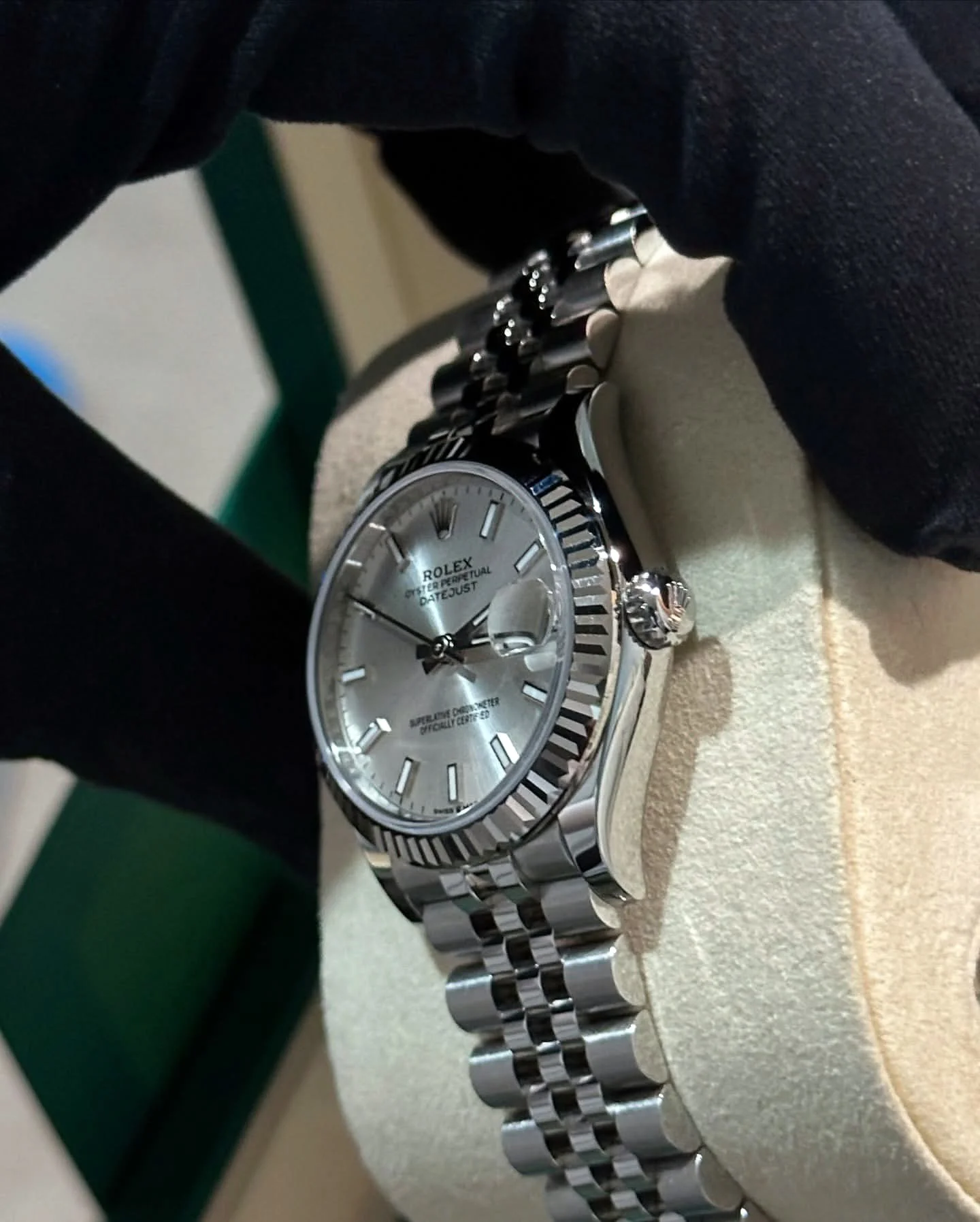 Silver dial powered by self winding automatic calibre 2236 with a power reserve of 55hrs.